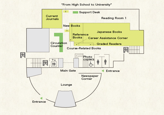 This area features the current month’s editions of major Japanese and foreign newspapers, located in the newspaper lounge and on racks.