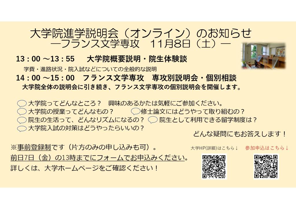 下記の日程で、明治学院大学大学院の全体およびフランス文学専攻の進学説明会が