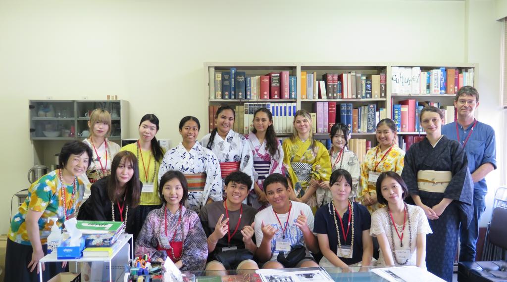 その後、フランス語の絵本を読みながら、男子高校生と本学の学生が親しく交流しました。女子高校生たちは、浴衣の着付けワークショップに参加しました。初めての和服体験でしたが、明学生のサポートのおかげで、目をキラキラ輝かせながらその貴重な時間を楽しんでいました。