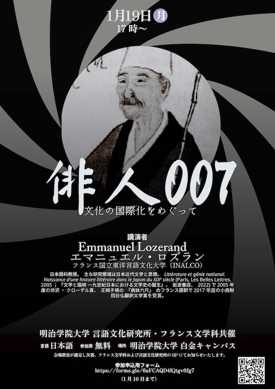 フランス国立東洋言語文化大学の日本語科教授であるエマニュエル・ロズラン氏による講演会を、下記の日程にて開催いたします。小説家イアン・フレミングによる『ジェームズ・ボンド』シリーズで詠まれた俳句を切り口に、文化移転の可能性、過程、そしてその結果として生まれる文化的産物の性質について考察します。