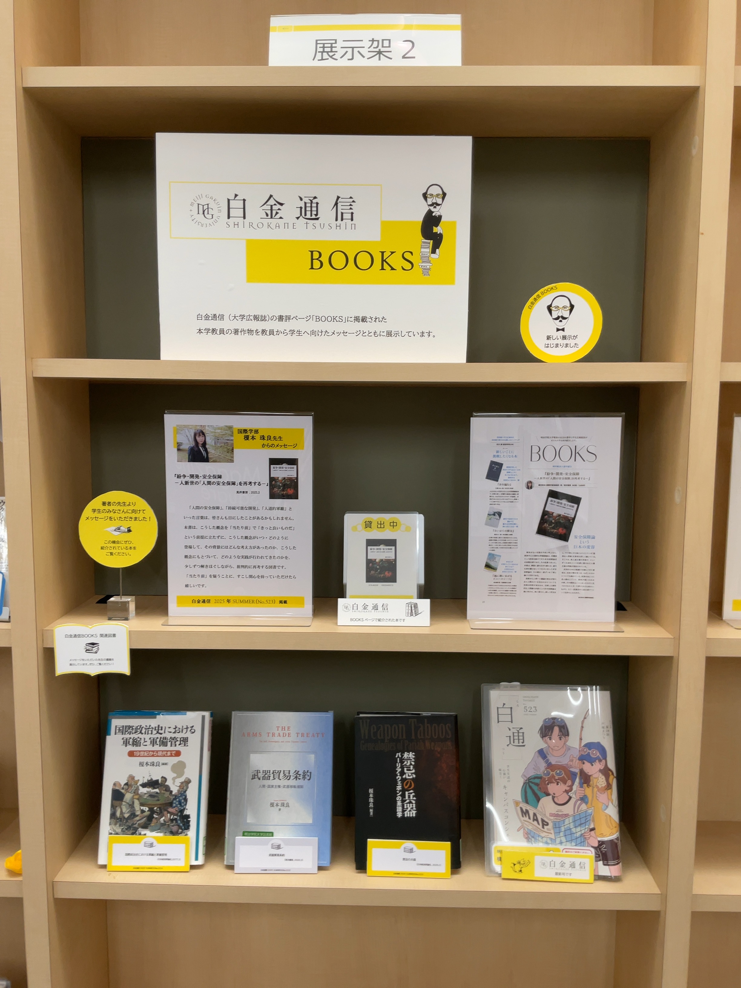 横浜図書館では、大学広報誌『白金通信』BOOKSコーナーで紹介された本学教員の書籍を教員から学生へ向けたメッセージとともに展示しております。