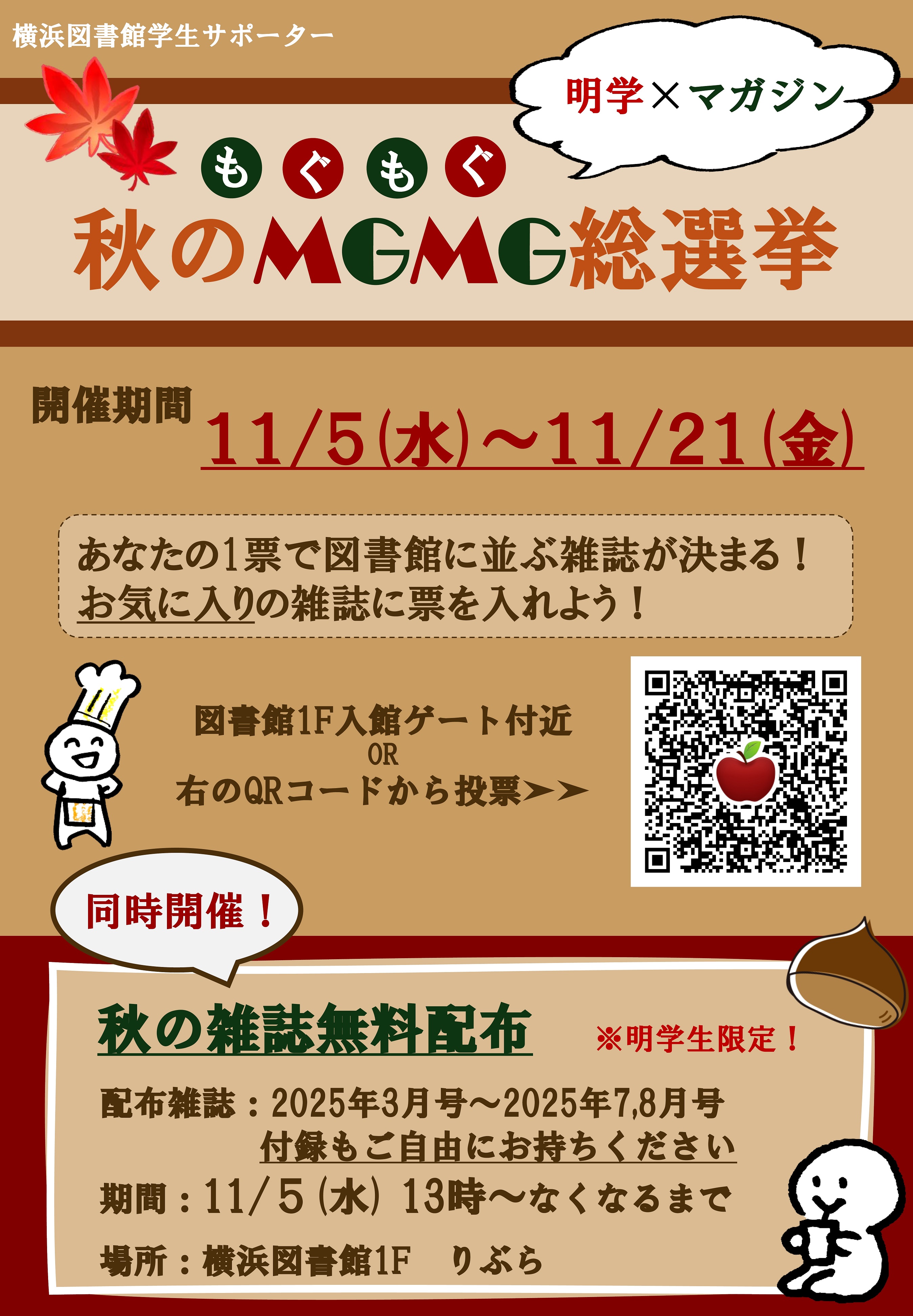 横浜図書館では、雑誌総選挙「秋のMGMG(もぐもぐ)総選挙」を開催します。