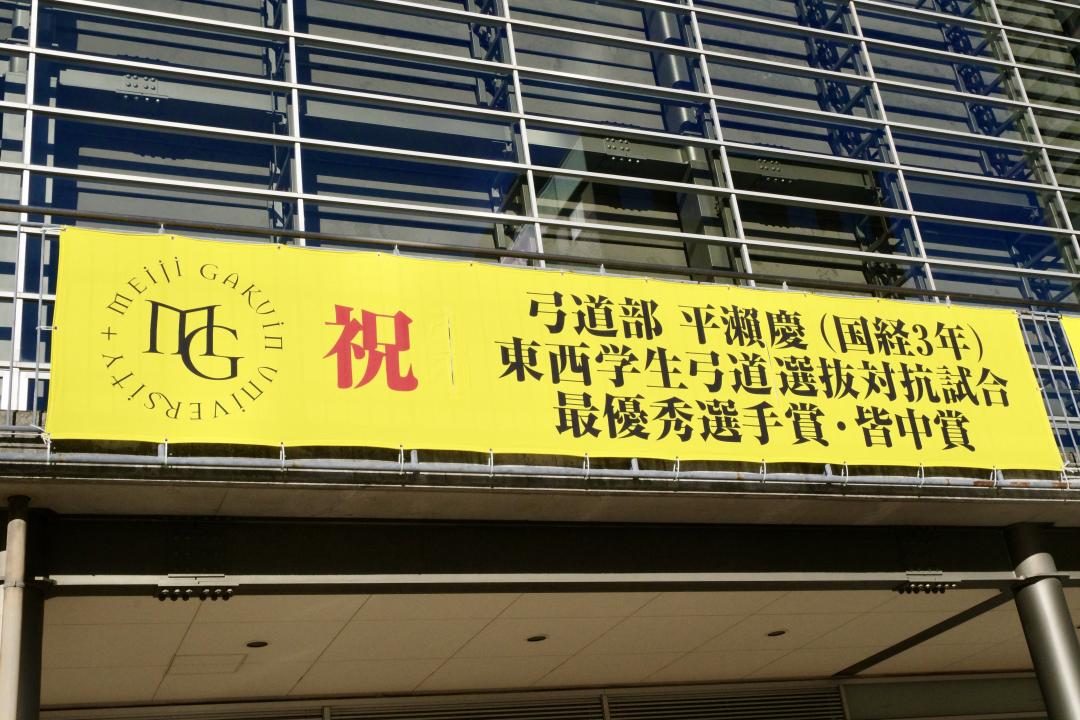 弓道部・平瀨慶選手/東西学生弓道選抜対抗試合での最優秀選手賞・皆中賞受賞の横断幕を設置