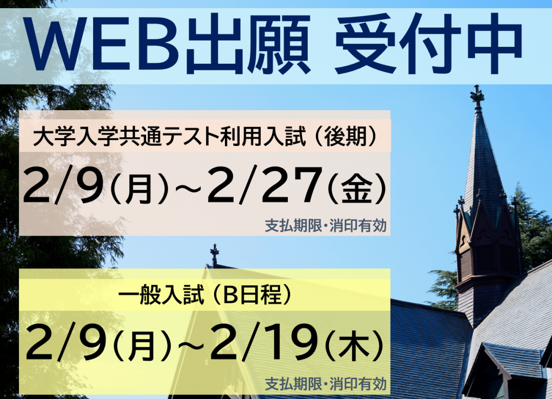 2/9(月)10:00より、一般入試(B日程)・大学入学共通テスト利用入試(後期)のWeb出願受付を開始しました。