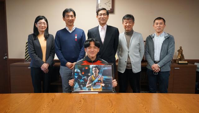 2023年1月24日(火)、榎本晃大選手(社会学部社会福祉学科2年)が黒田美亜紀陸上競技部長(法学部教授)、棚瀬亮治長距離ヘッドコーチと共に村田学長を表敬訪問しました。